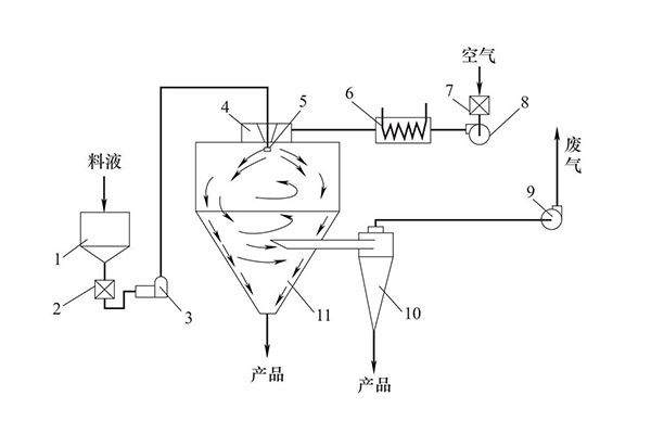 1—料液貯罐;2—料液過濾器;3—送料泵;4—熱風(fēng)分布器;5—霧化器;6—空氣加熱器;7—空氣過濾器;8—鼓風(fēng)機;9—引風(fēng)機;10—旋風(fēng)分離器;11—噴霧干燥器