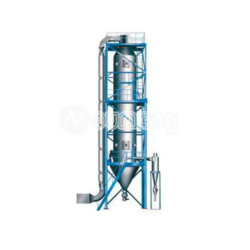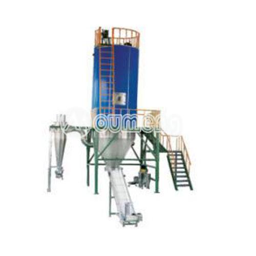 壓力噴霧干燥機(jī)是一種可以同時(shí)完成干燥和造粒的裝置。按工藝要求可以調(diào)節(jié)料液泵的壓力,流量,噴孔的大小,得到所需的按一定大小比例的球形顆粒。其工作過程為料液通過隔膜泵高壓輸入,噴出霧狀液滴,然后同熱空氣并流下降,大部分粉粒由塔底排料口收集,廢氣及其微小粉末經(jīng)旋風(fēng)分離器分離,廢氣由抽風(fēng)機(jī)排出,粉末由設(shè)在旋風(fēng)分離器下端的授粉筒收集,風(fēng)機(jī)出口處還可裝備二級(jí)除塵裝置,回收率在96-98%以上。其與物料接觸部分的塔體、管道、分離器的材料,均采用SUS304制作。在塔體內(nèi)部與外殼之間有足夠的保溫層,填充材料為超細(xì)玻璃棉,塔體設(shè)有觀察門、視鏡、光源及控制儀表,由電氣控制操作臺(tái)控制和顯示。其熱源裝置采用蒸汽加熱或電加熱器,具有操作方便、啟動(dòng)快、結(jié)構(gòu)緊湊、熱風(fēng)干凈清潔等優(yōu)點(diǎn)。另外在電氣控制柜內(nèi)裝有電加熱器的控制調(diào)節(jié)裝置,使進(jìn)口溫度無級(jí)調(diào)節(jié)。對(duì)于缺電地區(qū)可采用蒸汽加熱或燃煤、燃油熱風(fēng)爐等方式,局部或全部代替電加熱裝置。
